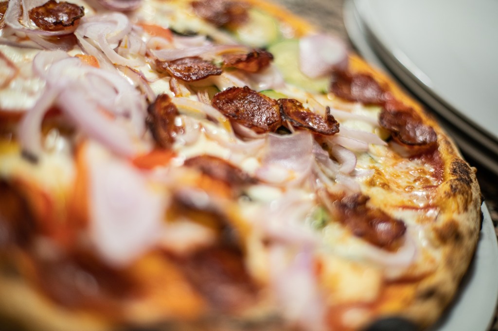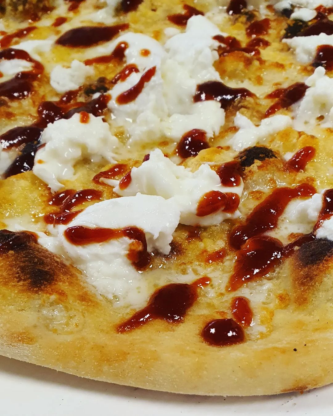 Bianca, mozzarella fiordilatte, radicchio di Treviso cotto in forno a legna, mostarda di cipolla rossa, pancetta Campagnola dopo cottura